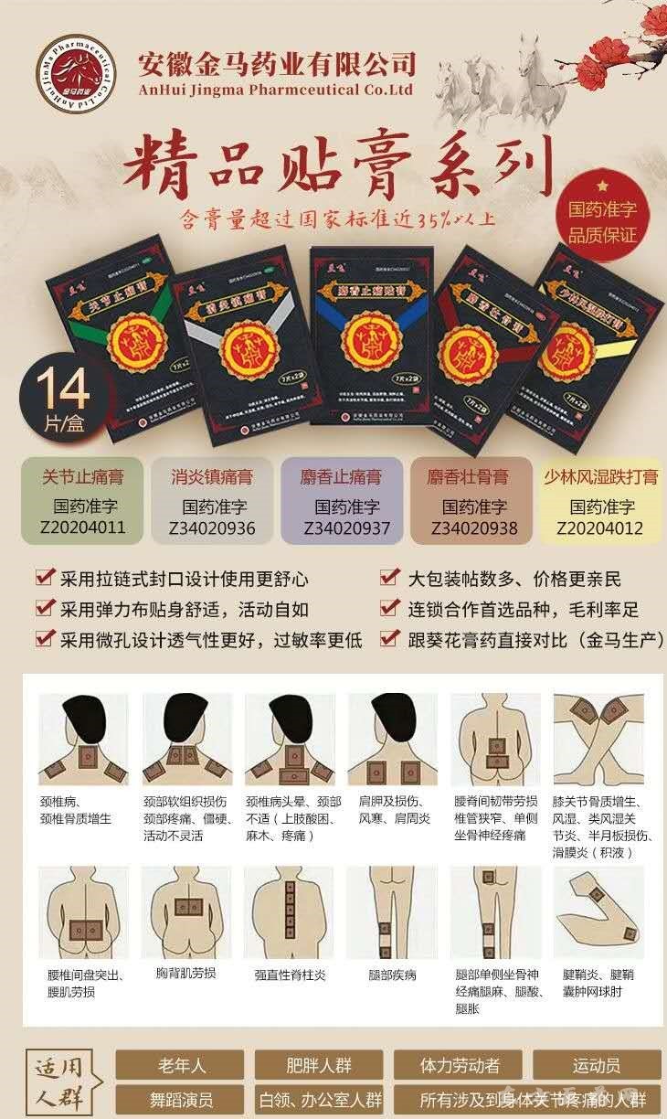 | 成份 | 八角茴香 山奈 生川乌 生草乌 麻黄 白芷 苍术 当归 干姜 人工麝香 薄荷脑 水杨酸甲酯 硫酸软骨素 冰片 盐酸苯海拉明 樟脑 辅料为:橡胶 松香 立德粉 凡士林 羊毛脂 |